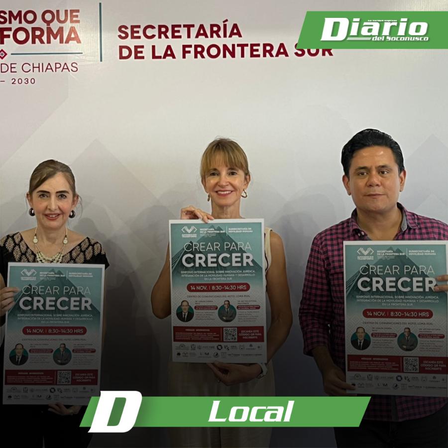Con la finalidad de atender a empresarios, emprendedores, jóvenes, estudiantes, personas en contexto de movilidad y población en general, el próximo viernes 14 de noviembre se realizará en Tapachula el Simposio Internacional denominado “Crear para Crecer”, organizado por la Secretaría de la Frontera Sur y el Colegio de Notarios Públicos de la Costa de Chiapas.
