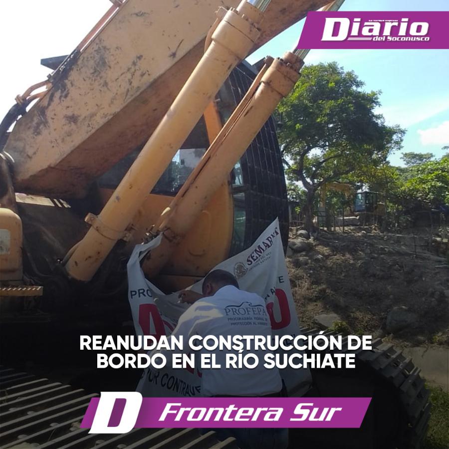 Los trabajos de construcción del muro de protección del río Suchiate se reanudaron este jueves, luego de que personal de la Procuraduría Federal de Protección al Ambiente (Profepa) quitara los sellos de clausura en la maquinaria pesada y del lugar, donde se deriva el agua para riego de los cultivos de los productores de plátano.