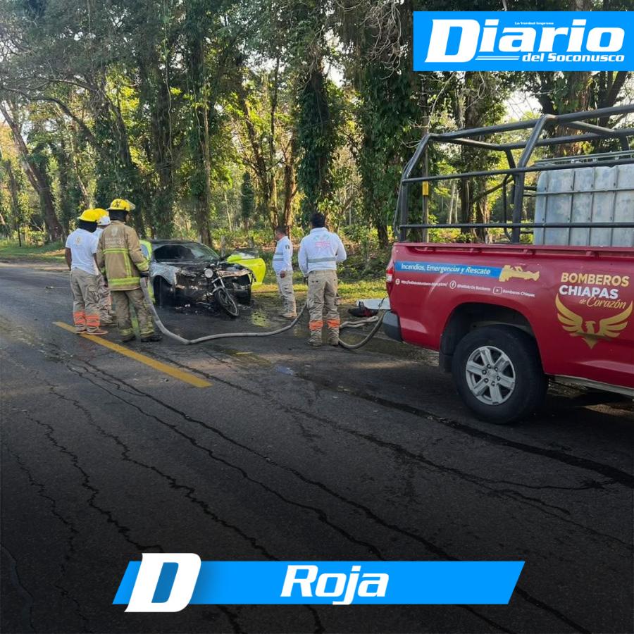 De acuerdo con los primeros reportes, tras el impacto una de las partes del vehículo deportivo comenzó a incendiarse, lo que movilizó de inmediato a elementos de Protección Civil y bomberos de Cacahoatán, así como personal de Protección Civil de Tuxtla Chico.