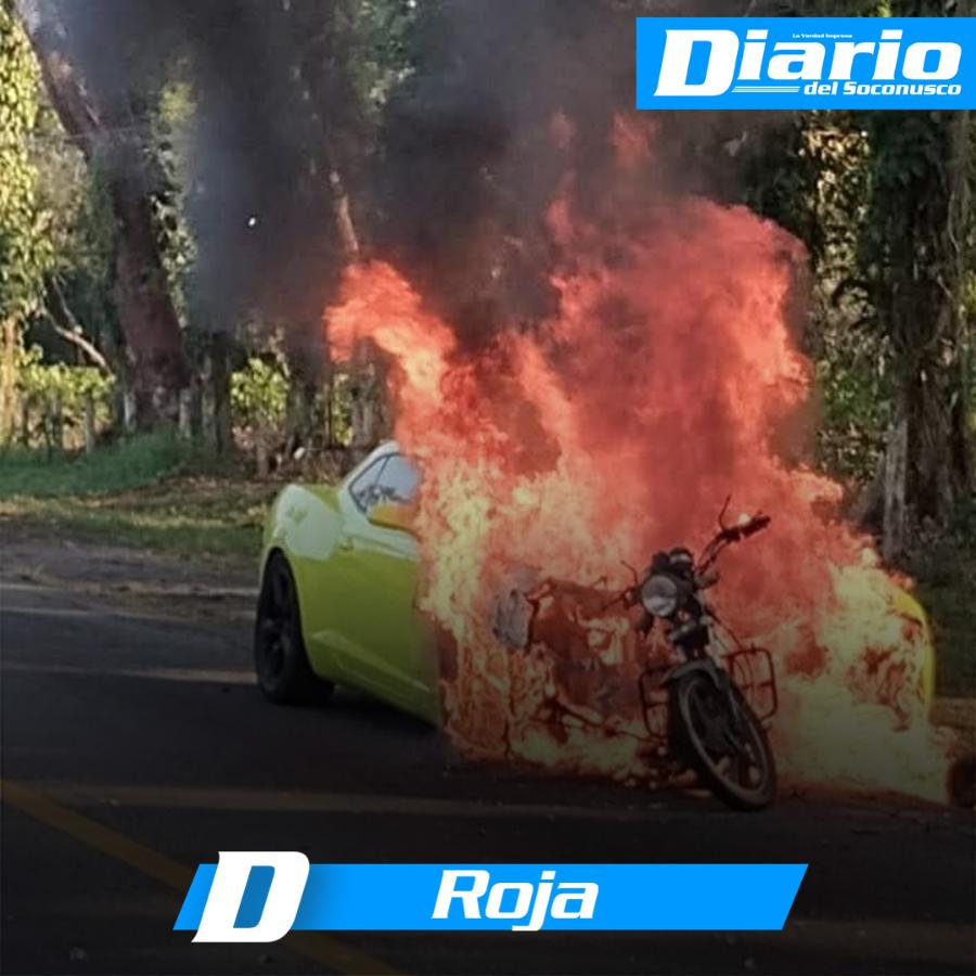 Un aparatoso accidente entre un automóvil deportivo Camaro y una motocicleta, terminó en incendio la tarde de este domingo sobre la carretera que conecta a Cacahoatán con Tuxtla Chico, a la altura del campo experimental del INIFAP.