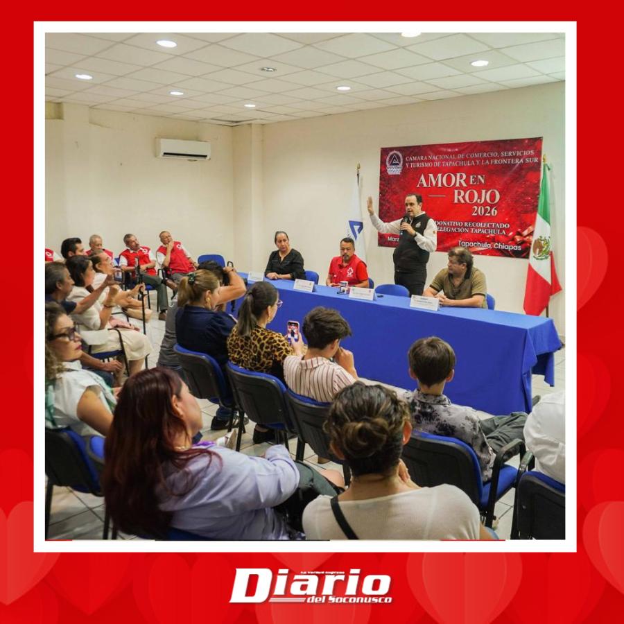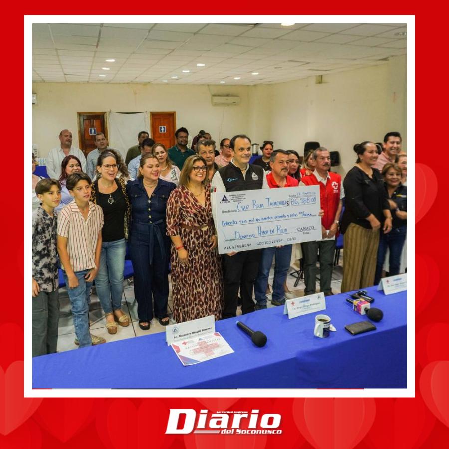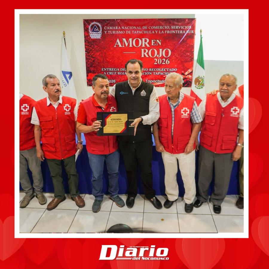 La Cámara Nacional de Comercio, Servicios y Turismo (Canaco) en Tapachula, encabezada por Jorge Zúñiga, realizó la entrega del donativo recaudado durante el evento “Amor en Rojo” a la Cruz Roja Mexicana, con el objetivo de fortalecer las labores humanitarias en la región.