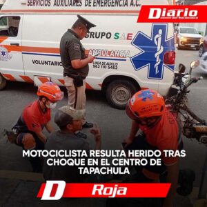 Darinel González Una joven motociclista resultó lesionada tras colisionar contra un automóvil en la rotonda Manuel Velasco Suárez, al suroriente de Tapachula, a la altura del fraccionamiento Solidaridad 2000. De