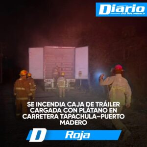 Darinel González / Diario de Chiapas Tapachula, Chiapas. La noche de este martes, una caja de tráiler que transportaba cajas de plátano se incendió sobre la carretera Tapachula–Puerto Madero, a