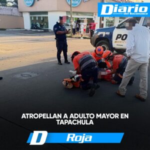 Darinel González / Corresponsal Diario del Soconusco Tapachula, Chiapas. Durante la mañana de este sábado, una persona de la tercera edad resultó lesionada luego de ser atropellada por un vehículo