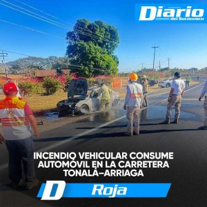 • Afortunadamente, no se reportan personas lesionadas, únicamente daños materiales Darinel González A los números del 911 reportaron un incendio vehicular sobre la carretera Tonalá–Arriaga, a la altura del desvío