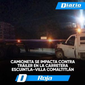 • Colisionan camioneta contra remolque de tráiler en la vía Escuintla–Villa Comaltitlán Darinel González Un fuerte accidente vehicular se registró sobre la carretera Escuintla–Villa Comaltitlán, lo que provocó la movilización