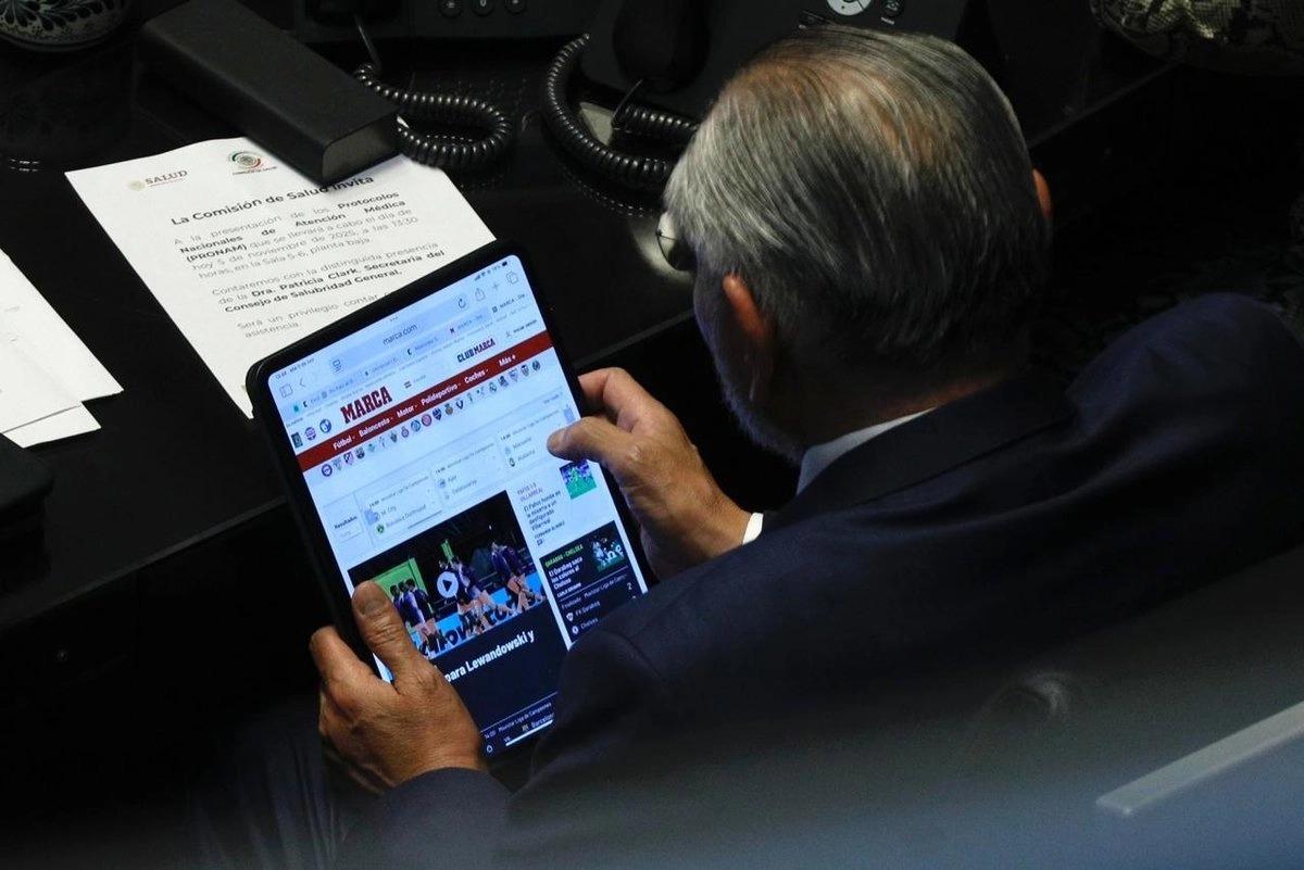 Ciudad de México. El coordinador de Morena, Adán Augusto López Hernández fue captado nuevamente mientras veía partidos de futbol en su tableta electrónica durante la sesión de hoy del Senado, por el fotógrafo de La Jornada, Germán Canseco, lo que motivó que él y los demás reporteros gráficos fueran obligados por personal de Resguardo Parlamentario a moverse al otro lado del balcón donde están asignados