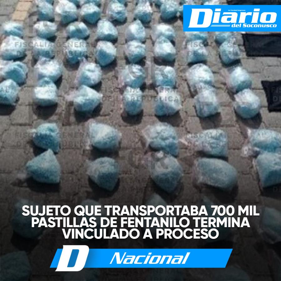 México.– Un hombre detenido por transportar aproximadamente 700 mil pastillas de fentanilo fue vinculado a proceso por su presunta responsabilidad en delitos contra la salud, informaron autoridades federales.
