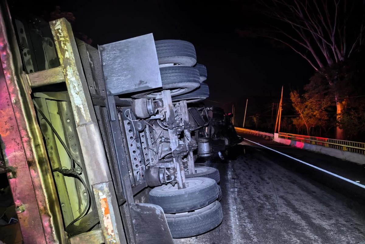 Tras el reporte de automovilistas que circulaban por la zona, elementos de la Guardia Nacional División Caminos, acudieron al sitio y localizaron un tráiler Kenworth de color blanco completamente volcado el cual estaba sobre los muros de contención de concreto.