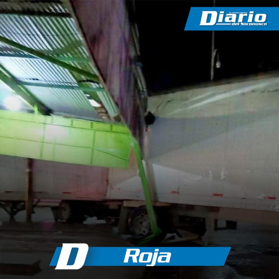 Un tráiler con doble remolque causó severas afectaciones a la estructura metálica de la galera del sitio de taxis, frente al Instituto Mexicano del Seguro Social (IMSS) de Huixtla.