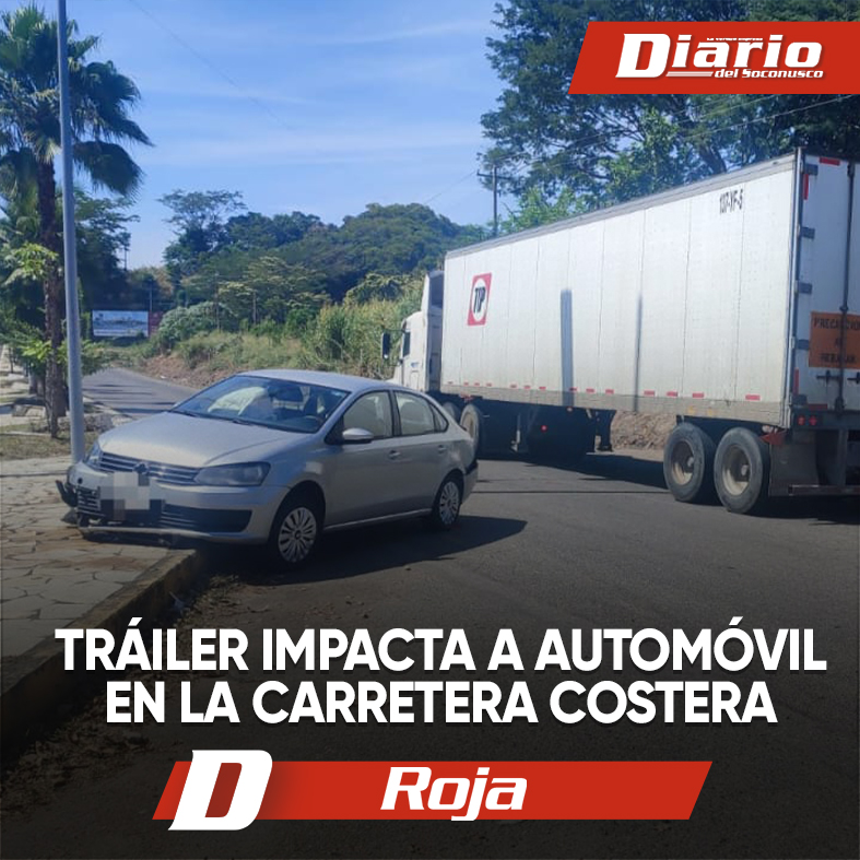Un aparatoso accidente se registró la tarde de este jueves sobre la carretera costera, a la altura de la entrada del fraccionamiento Framboyanes, donde un tráiler impactó a un automóvil Volkswagen Vento color plata, dejándolo sobre el camellón central y en sentido contrario al que circulaba.