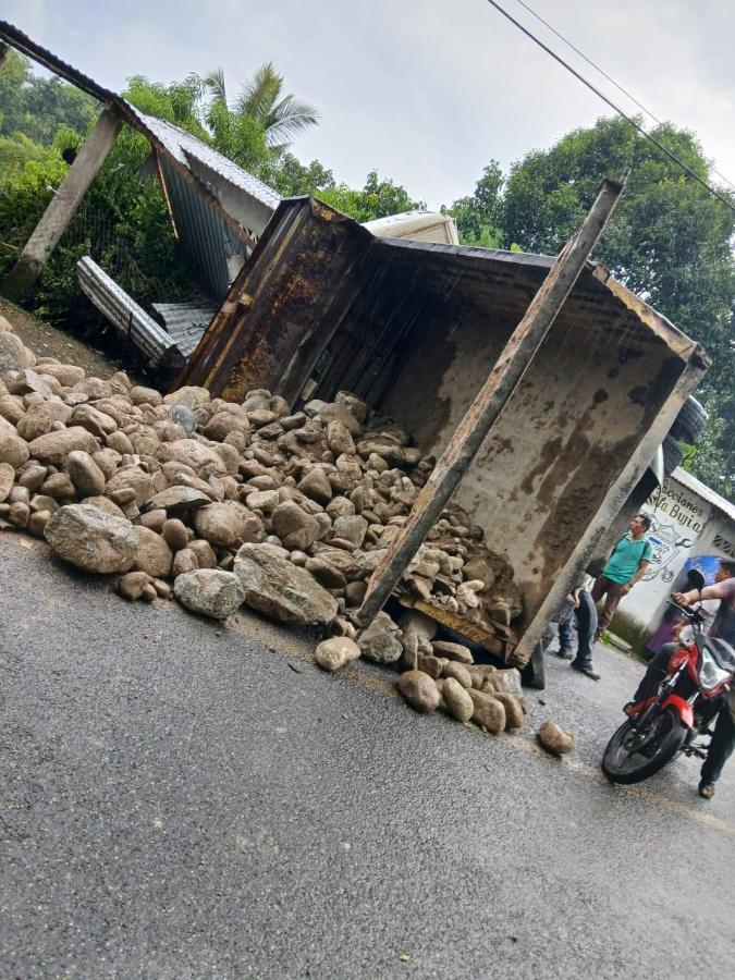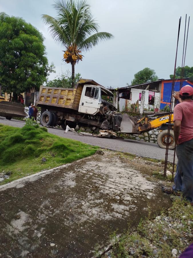 Un fuerte accidente protagonizado por un camión tipo volteo, utilizado para el acarreo de material pétreo, dejó como saldo dos personas lesionadas y daños materiales en la sierra de Escuintla.