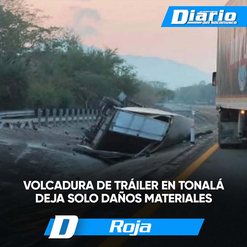 La mañana de este martes se registró la volcadura de un tráiler tipo Kenworth sobre la carretera costera Arriaga–Tonalá, a la altura del puente Quetzalapa, sin que se reportaran personas lesionadas.