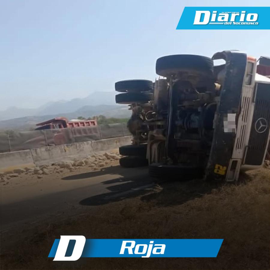 El accidente ocurrió a la altura del retorno ubicado en esta vía, donde por causas que hasta el momento se desconocen, el conductor perdió el control de la pesada unidad, lo que provocó que terminara volcada.