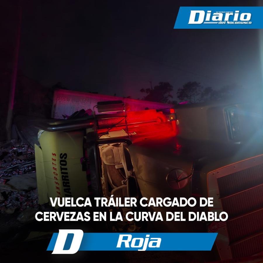 Por tercera ocasión en lo que va de 2026, se registró una aparatosa volcadura de tráiler en la conocida Curva del Diablo, lo que derivó en actos de rapiña, ya que la unidad transportaba cervezas.