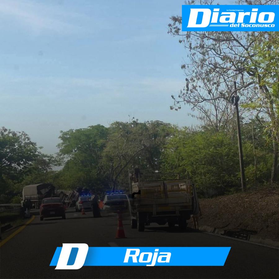 Una caja de doble remolque ensamblada a un tráiler tipo Kenworth, de color blanco, volcó sobre la carretera Pijijiapan–Mapastepec, a la altura de la conocida curva de Caña Brava.